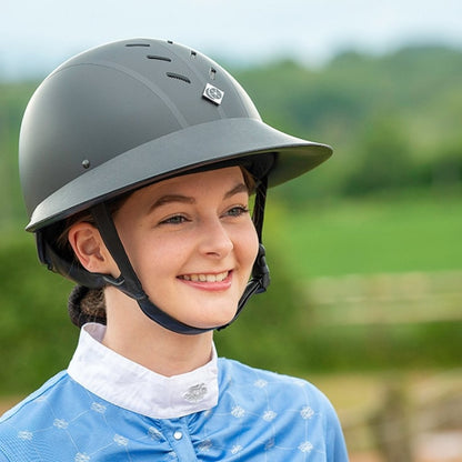 Experience the pinnacle of safety and style with the CHARLES OWEN My PS with Wide Peak helmet. This riding helmet not only offers an elegant wide peak design that shades your face and upper neck from the sun but also provides enhanced protection certified to three international equestrian safety standards.