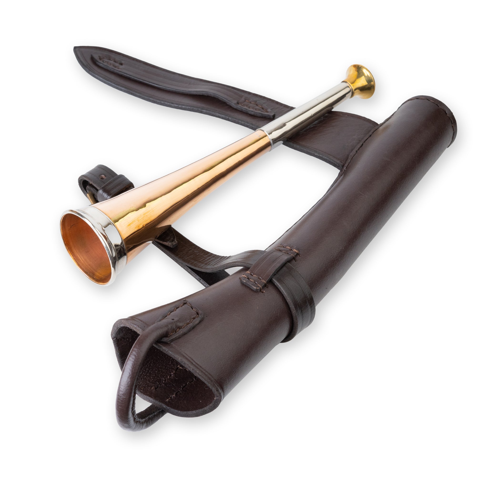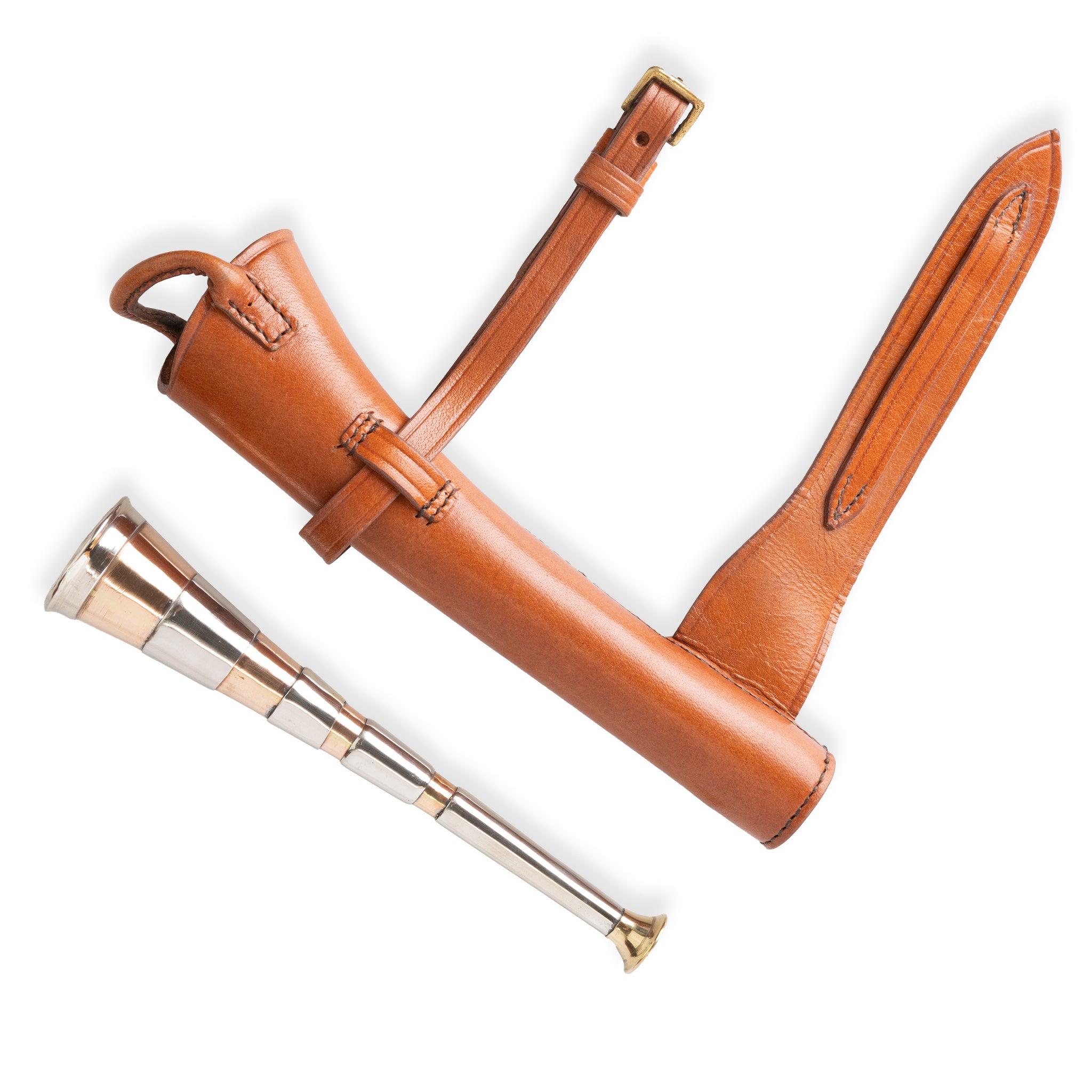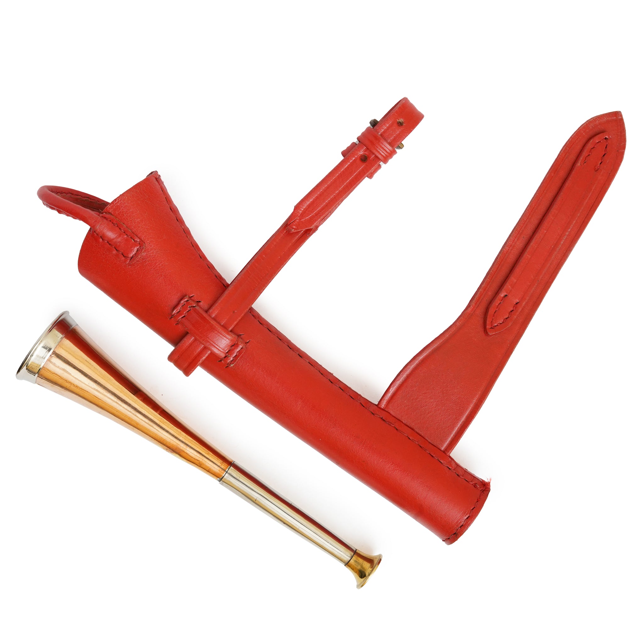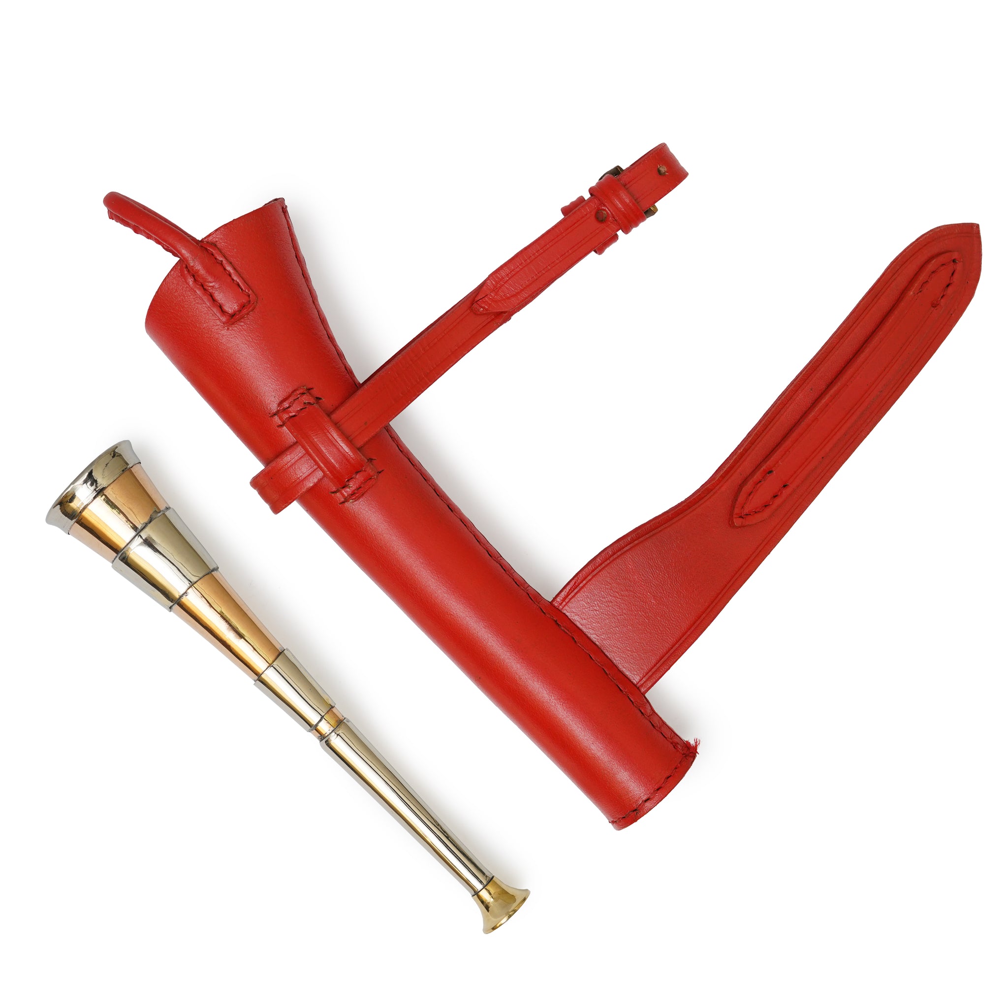 Perfectly balanced between form and function, this fox hunting horn is also lightweight and compact, allowing it to be easily carried or stored without adding bulk to your gear. Whether used in active hunts or displayed as a collector’s item, its polished finish and vintage aesthetic evoke the rich heritage of traditional British countryside sports. The inclusion of a red leather case adds a touch of luxury and protection, preserving the horn's gleaming surface while enhancing its portability. This combination of craftsmanship, utility, and style makes it a standout accessory for riders, huntsmen, or those seeking an authentic decorative piece. A truly classic addition to any hunting kit or equestrian ensemble, this fox hunting horn captures the spirit of the chase with sophistication and grace.