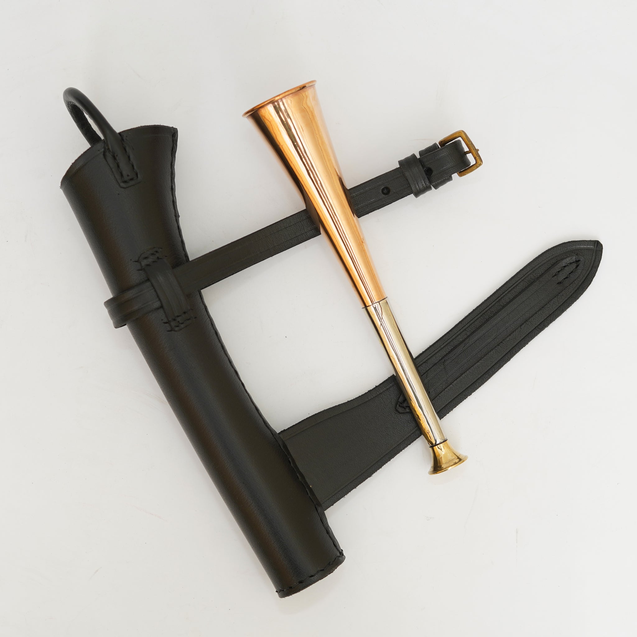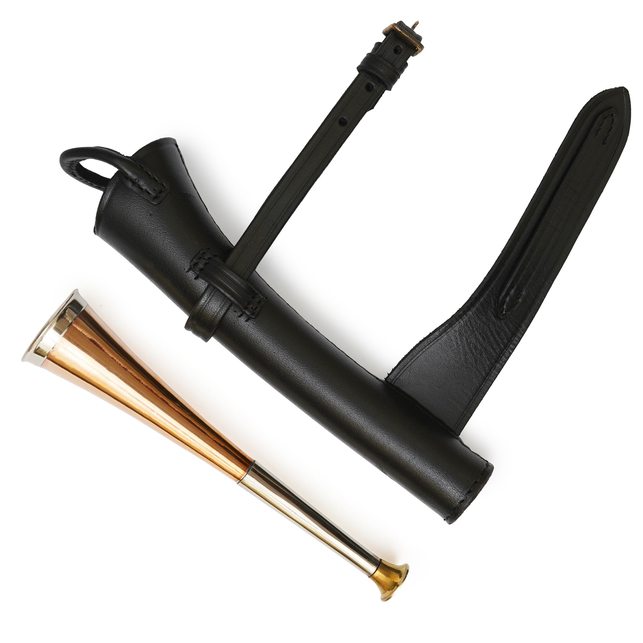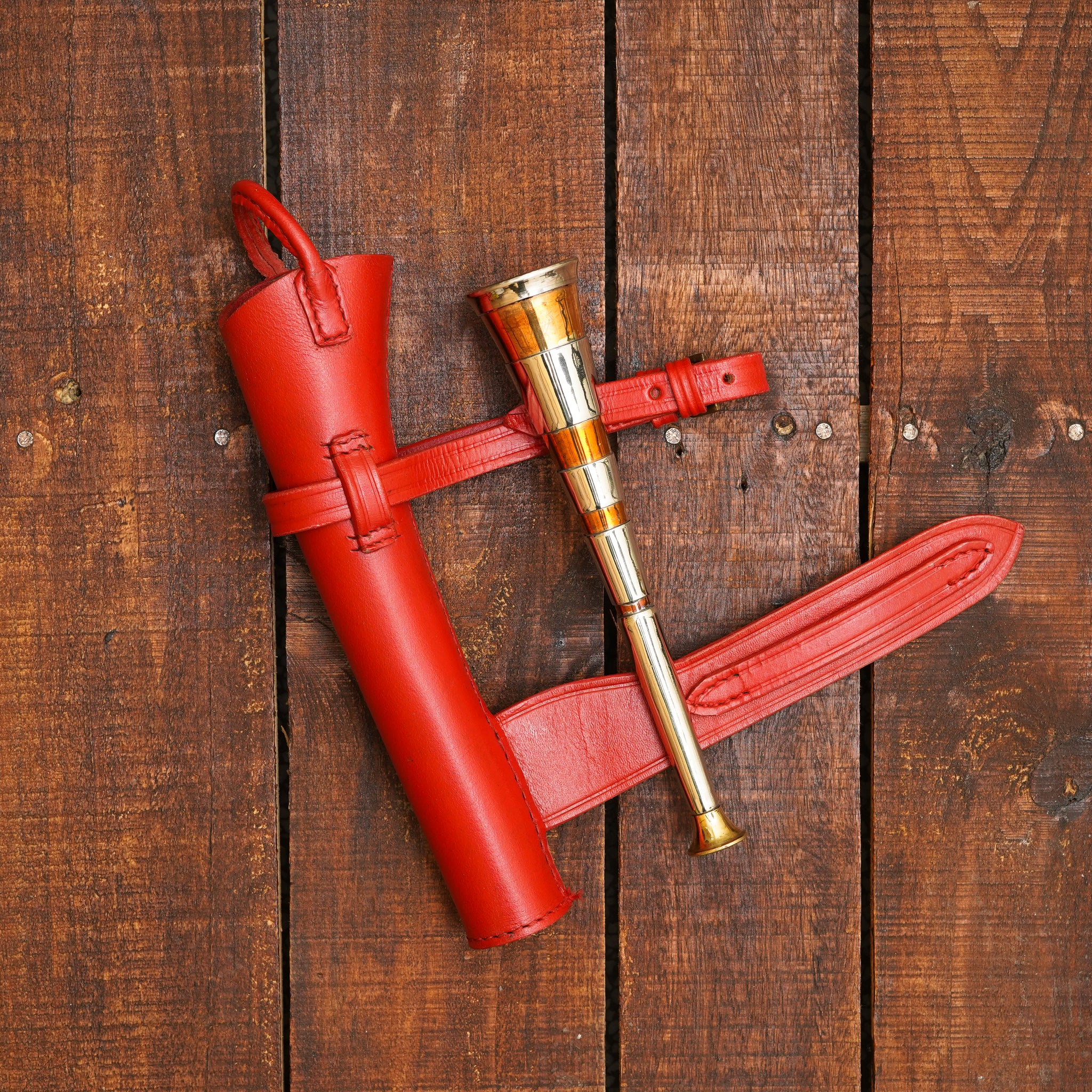 The Fox Hunting Horn With Red Leather Case is a timeless piece designed for both functionality and traditional elegance. Crafted from premium copper, this hunting horn showcases a polished, golden-toned finish that gives it a vintage charm while ensuring long-lasting durability. Its slim, tapered structure allows for effortless handling, making it ideal for fox hunting enthusiasts who value control and precision during outdoor pursuits. The flared, golden mouthpiece is thoughtfully designed to provide smooth airflow, resulting in a clear and commanding sound with every blow. At the bell end, the wider opening amplifies the resonance, ensuring your signal is loud and unmistakable across fields and woodlands.