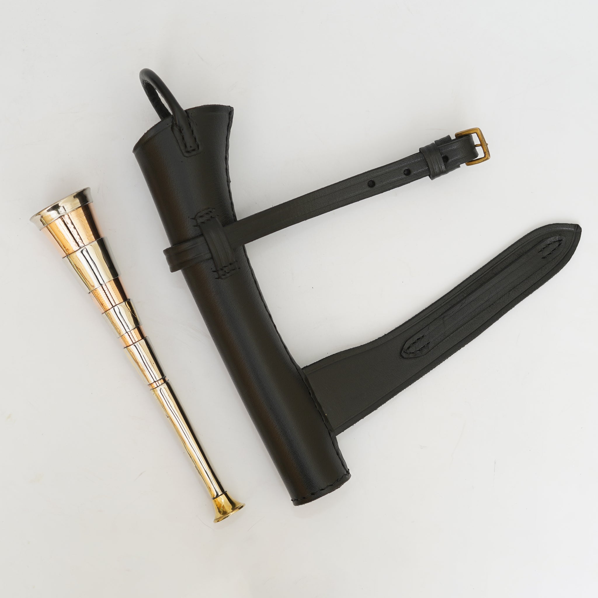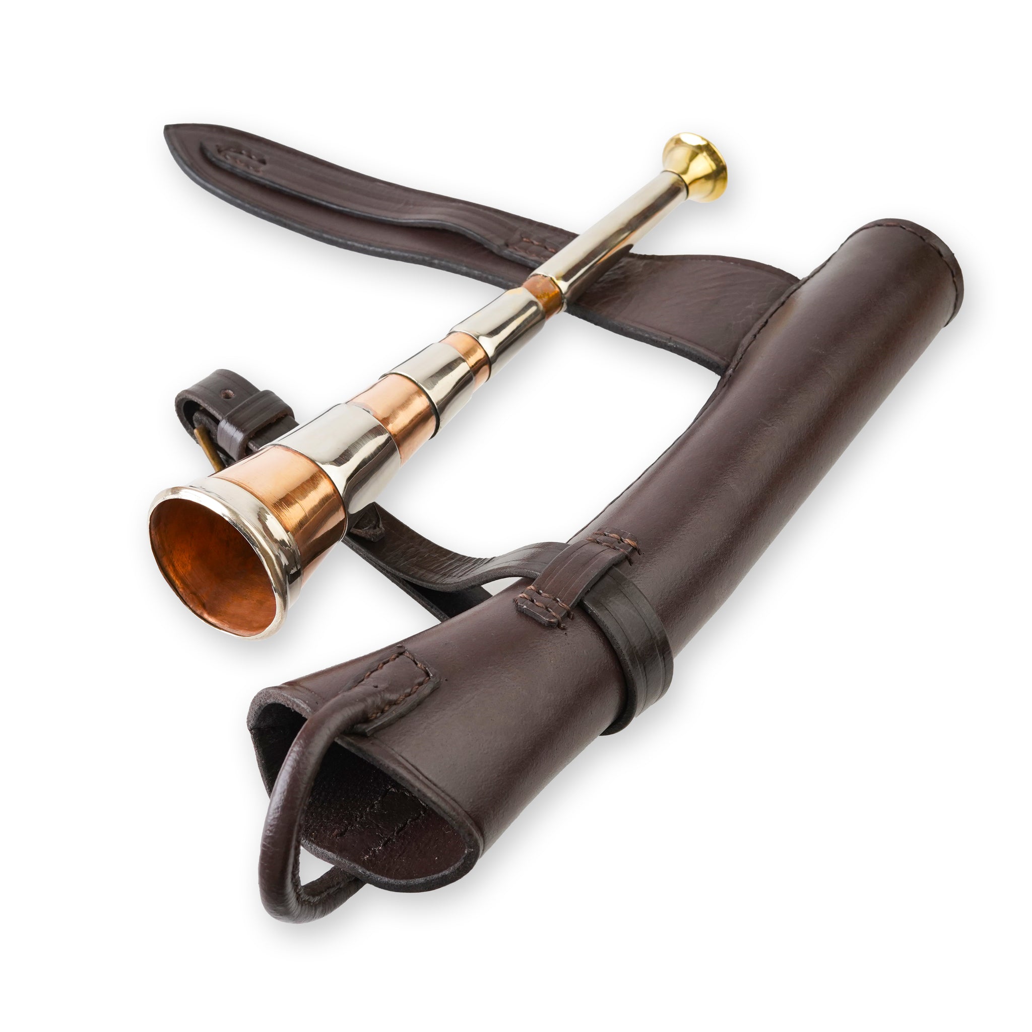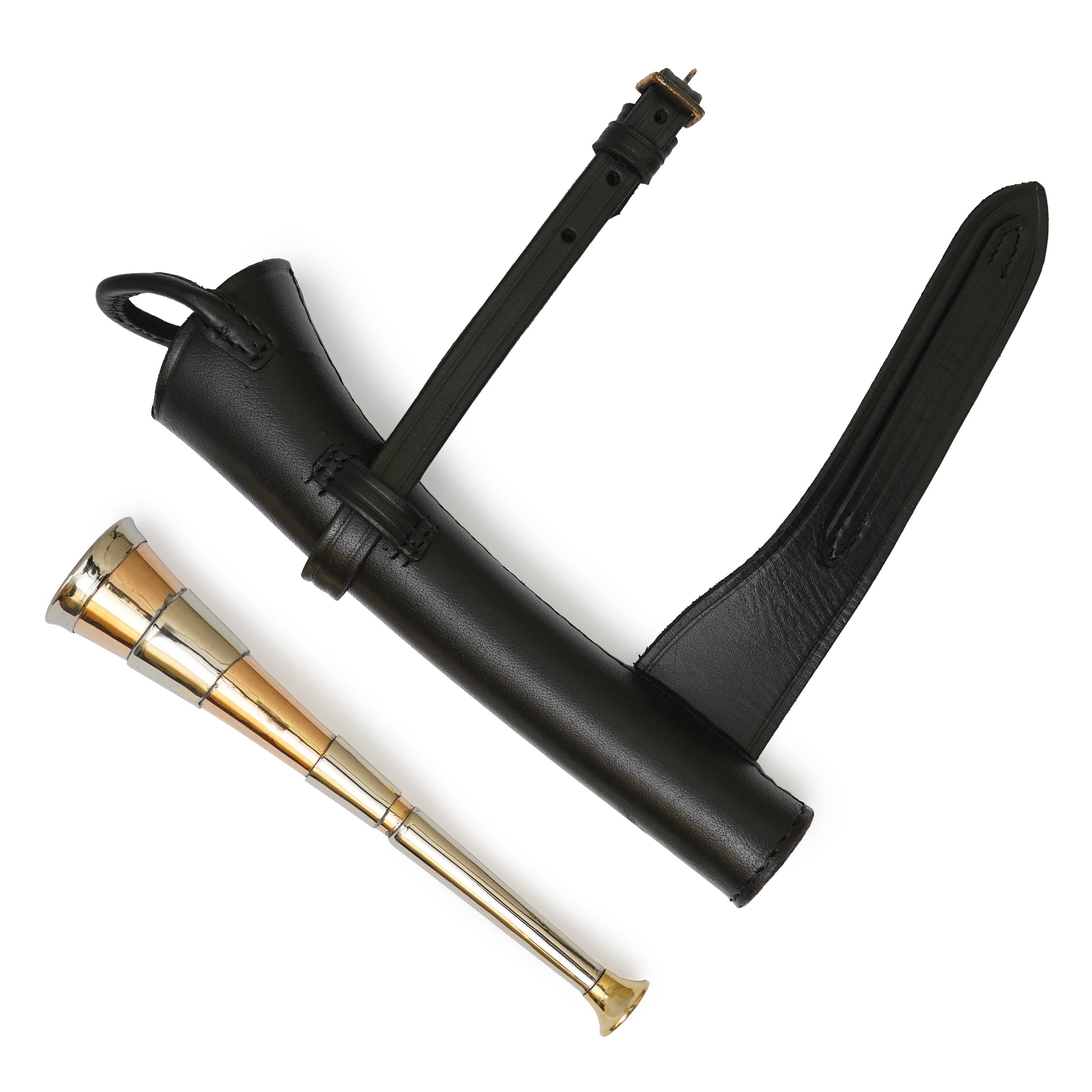 The Fox Hunting Horn With Red Leather Case is a timeless piece designed for both functionality and traditional elegance. Crafted from premium copper, this hunting horn showcases a polished, golden-toned finish that gives it a vintage charm while ensuring long-lasting durability. Its slim, tapered structure allows for effortless handling, making it ideal for fox hunting enthusiasts who value control and precision during outdoor pursuits. The flared, golden mouthpiece is thoughtfully designed to provide smooth airflow, resulting in a clear and commanding sound with every blow. At the bell end, the wider opening amplifies the resonance, ensuring your signal is loud and unmistakable across fields and woodlands.